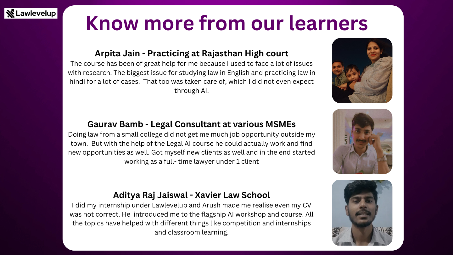 - Expert Guidance: Benefit from mentorship by Arush who understand the legal AI landscape.